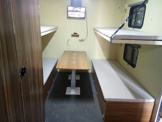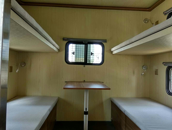3、休息區備有4個上下鋪,配有床墊,每個上下床鋪依靠的墻壁上都有一個風景透氣窗。每個床鋪下面設一組附件柜,床位兩側上方各配衣帽鉤、插座和可調節床頭燈,休息區配有19寸液晶電視一臺及空調一部。