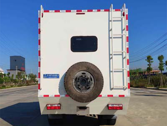 三、東風四驅越野宿營車, 4驅越野宿營車用途:適用公安、特警、公安、邊防、衛生、交通、礦山、地質、軍隊等部門]長期野外作業、勘察、救援、搶險、救災等宿營用,箱體空間利用大化。內部配置:配備前儲物柜、后儲物柜、液晶電視機應急燈、頂燈、頂置空調、床墊、被褥等。選裝配備8組豪華折疊臥鋪、未鋪上下梯、安全保險帶、電源插口等,細節精致。外置燃油加熱器、頂護欄、前爬梯、隱藏抽拉梯、專用房車門、專用玻璃滑窗、警示燈等。