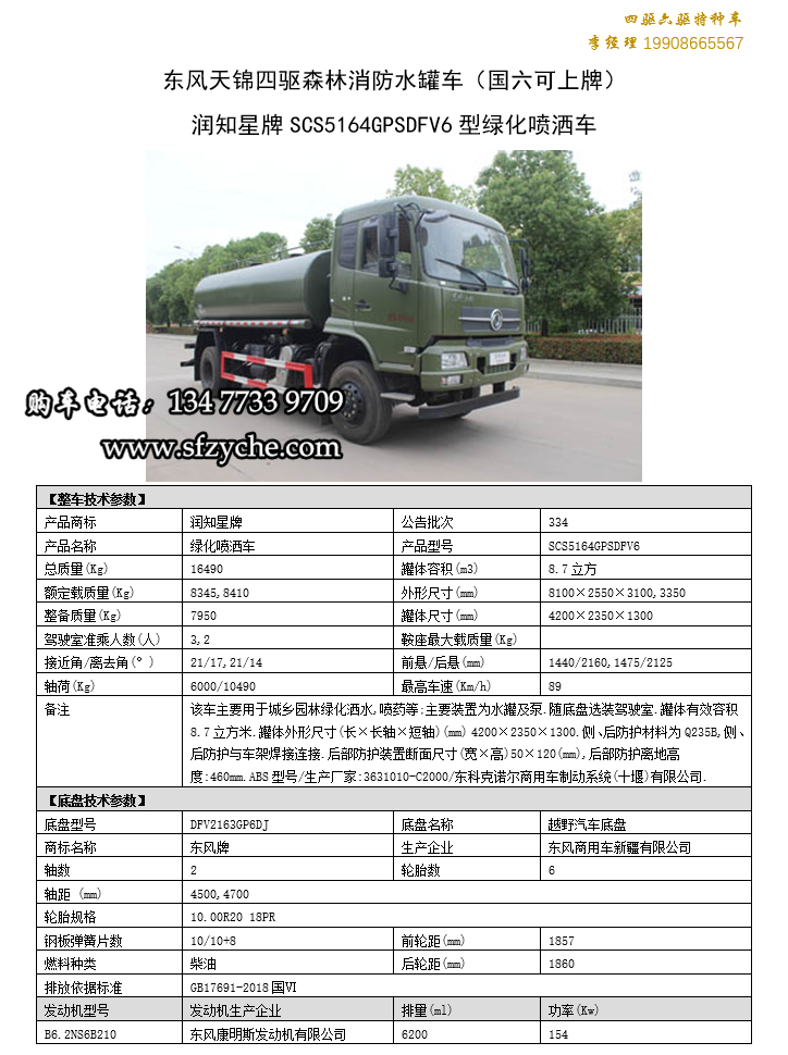國六排放潤知星牌SCS5164GPSDFV6型四驅越野綠化噴灑車,東風天錦四驅森林消防灑水車,該車主要用于城鄉園林綠化灑水,噴藥等;主要裝置為水罐及泵.隨底盤選裝駕駛室.罐體有效容積8.7立方米.罐體外形尺寸(長×長軸×短軸)(mm) 4200×2350×1300.側、后防護材料為Q235B,側、后防護與車架焊接連接.后部防護裝置斷面尺寸(寬×高)50×120(mm),后部防護離地高度:460mm.ABS型號/生產廠家:3631010-C2000/東科克諾爾商用車制動系統(十堰)有限公司.
