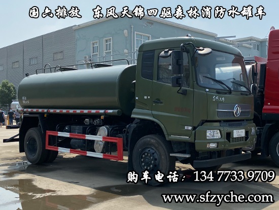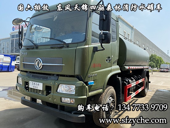 東風天錦四驅森林消防灑水車_國六排放潤知星牌SCS5164GPSDFV6型四驅越野綠化噴灑車采用DFV2163GP6DJ型國六排放東風天錦四驅越野底盤,東風天錦D530一排半駕駛室,4×4驅動,康明斯B6.2NS6B210國六發動機210馬力,最大扭矩850N.m/1100-1700rpm,排量6.2L、韶齒手動六檔變速箱,東風德納車橋,前驅動橋4.5噸,后橋10噸,10.00R20輪胎,軸距4500mm/4700mm,電動玻璃,方向助力,斷氣剎,ABS,大燈自動調節,自動調整臂,選裝原廠空調。罐體采用優質碳鋼Q235板材,板材厚度4mm,罐體容積8.7立方,安裝夾心取力器,后置泵箱,消防栓接口左右各一個,消防炮采用PS30-50D消防水炮,流量40L/S/1.0MPa 水射程:≥50m,消防泵采用常壓消防泵型號:CB10/40車用消防泵,流量:40L/s,壓力:1.0MPa,駕駛室頂部安裝長條警燈帶喊話器,兩側噴涂白色森林消防字樣。