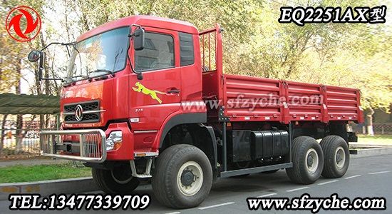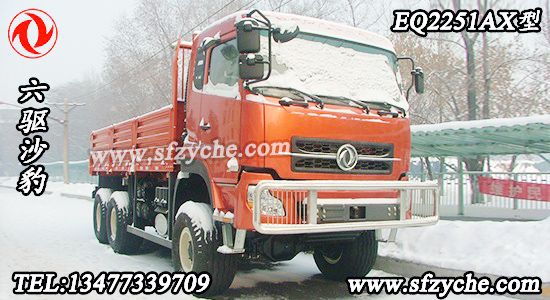 東風牌EQ2251AX型沙漠越野車配置:采用東風新款D310平頂單臥駕駛室,發動機:康明斯375馬力國四發動機 直列增壓中冷六缸水冷柴油機 ISLe375 40;北方奔馳同步器型9擋箱 9T-160 Φ430mm,膜片彈簧拉式離合器,7T前橋,10T 重慶大江雙級減速雙后橋 14.00-20輪胎 (選裝20-20 沙漠胎)軸距3800+1400 鋼板彈簧片數9/10,油箱350L,貨箱尺寸:5720×2294×800mm,整車外形尺寸:8470×2500,2700×3520,動力轉向。如需了解更多東風六驅沙漠車圖片,東風六驅沙漠車價格,東風六驅沙漠車參數,請立即撥打銷售熱線:13477339709 李經理 0722-7053060 業務QQ:530233927,東風越野卡車網址:www.wgsj88.com
