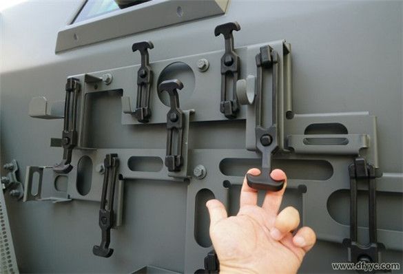 上圖是東風四驅防雷反恐戰車右前側圍懸掛附加工具或補給品的懸掛特寫。用手較費勁的抻拉橡膠懸掛鎖具。備用工具通過橡膠掛具與背板固定在車身側面,背板拆卸后可以成為盤等工具。