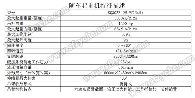 凈功率206kw; 起重機(jī)型號(hào)為:SQ302Z(帶液壓油箱),起重機(jī)質(zhì)量為:1200kg,最大額定超升載荷為:3000kg. 側(cè)防護(hù)金屬材料Q235斷面槽形,螺栓連接,斷面高度40mm,離地高度450mm; 后防護(hù)金屬材料Q235斷面槽形,螺栓連接,斷面高度135mm,離地高度500mm; 安裝具有衛(wèi)星定位功能行駛記錄儀,東風(fēng)越野隨車吊:www.wgsj88.com 吊機(jī)詳細(xì)參數(shù):