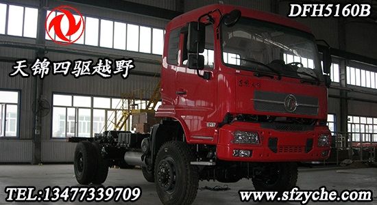 DFH5160B東風天錦四驅越野沙漠車,天錦D530平頭一排半低頂駕駛室,康明斯ISB210 40正宗國四210馬力發動機,立式、直列、水冷、四沖程、空空中冷、直噴柴油機,軸距4200mm,帶電加熱冷起動裝置,全鋼160L燃油箱,有三合一燃油箱鎖,電子油門踏板,消聲器排氣口向外(側吹),Φ350mm推式膜片彈簧離合器,8檔變速箱,變速箱速比Ⅰ8.12 Ⅱ6.08 Ⅲ4.47 Ⅳ3.31 Ⅴ2.46 Ⅵ1.84 Ⅶ1.35 Ⅷ1.00 RL8.12 RH2.46,分動箱高低檔帶差速鎖 、氣動式換檔操縱,4.5噸前橋鑄造橋殼,驅動轉向橋,輪間差速器鎖,10噸雙后橋輪邊減速,鑄造橋殼,輪間差速器鎖,主減速比5.921,帶ABS。
