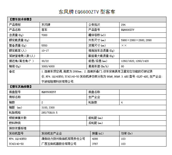 EQ6600ZTV四驅(qū)越野客車圖片,國五排放四驅(qū)10座越野客車價(jià)格,6米四驅(qū)客車多少錢,東風(fēng)四驅(qū)越野客車參數(shù)配置: 1.底盤型號(hào)EQ6550KZ5T,發(fā)動(dòng)機(jī)型號(hào):YC4S140 50 國五排放 2.整車外形尺寸長寬高:(5980×2060×2890)mm 驅(qū)動(dòng)形式:4×4 東風(fēng)分時(shí)四驅(qū) 3.離合助力,方向助力,斷氣剎,鼓式自動(dòng),駕駛區(qū)域空調(diào) 4.車橋?yàn)闁|風(fēng)德納,輪胎為265/70R19.5型越野輪胎,ABS 5.工具箱,前置防裝杠,粘接式推拉玻璃,發(fā)動(dòng)機(jī)底板防護(hù) 6.鋁花紋地板,中檔皮革座椅10個(gè)+1個(gè)折疊座椅,整車座椅安全帶,手動(dòng)式外擺門,正副司機(jī)門,后置雙開門,東風(fēng)原廠派恩頂置空調(diào) , 7.窗簾,滅火器兩個(gè),備胎一個(gè),獨(dú)立燃油暖風(fēng)系統(tǒng)帶兩個(gè)雙面王出風(fēng)口 8.其它為EQ6600ZTV型四驅(qū)越野客車標(biāo)配。具體配置參數(shù)參照(附件一)。 成品合格證、全額上戶發(fā)票、隨車工具、隨車文件各一套。