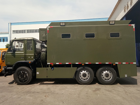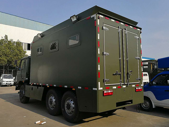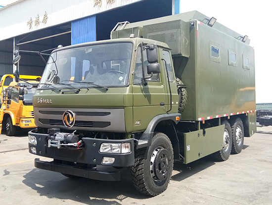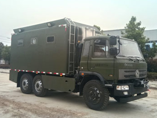 東風國五六驅越野自行式炊事車_東風軍用六驅炊事車_六驅野戰自行式餐廚車為部隊提供一種機動、高效的專用現場飲食保障裝備,滿足部隊平時及野外值勤時的主副食的飲食保障工作,并解決部隊行進中不停車做飯菜的需要及供應飲用水的需求。六驅自行炊事車功能簡介:該裝備主要編配于部隊,為部隊官兵野外作業時提供良好的飲食保障:具有制作食品、保溫食品和儲存食品的空間與功能、并具有提供開水和餐具消毒的功能。